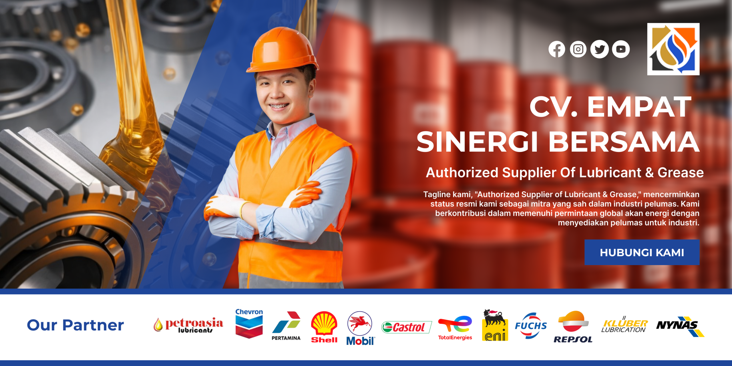Tagline kami, “Authorized Supplier of Lubricant & Grease,” mencerminkan status resmi kami sebagai mitra yang sah dalam industri pelumas. Kami berkontribusi dalam memenuhi permintaan global akan energi dengan menyediakan pelumas untuk industri.